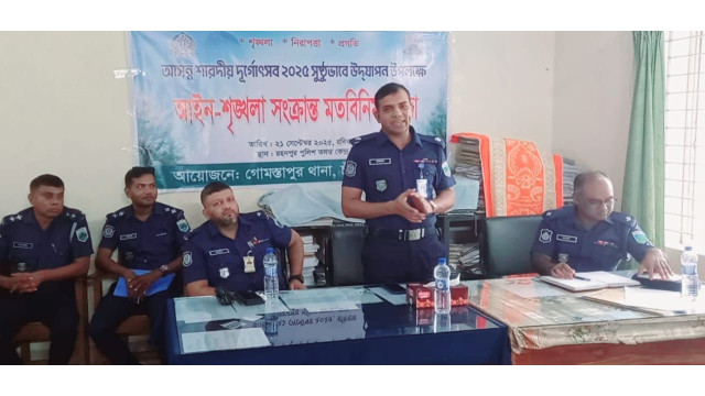 চাঁপাইনবাবগঞ্জের গোমস্তাপুরে আসন্ন শারদীয় দূর্গোৎসব ২০২৫ উদযাপন উপলক্ষে গোমস্তাপুরে আইন-শৃঙ্খলা সংক্রান্ত মতবিনিময় সভা অনুষ্ঠিত হয়েছে।