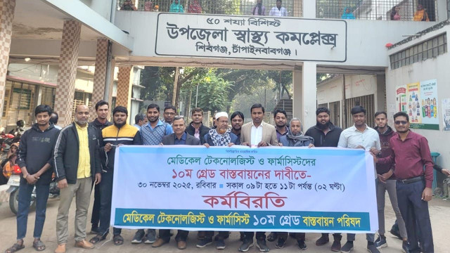 সারাদেশের মতো চাঁপাইনবাবগঞ্জের শিবগঞ্জেও সকাল ৯টা থেকে ১১টা পর্যন্ত মেডিকেল টেকনোলজিস্ট ও ফার্মাসিস্টদের পূর্বঘোষিত দুই ঘণ্টার শান্তিপূর্ণ কর্মবিরতি পালন হয়েছে। এতে দূর-দূরান্ত থেকে আসা রোগীরা পরীক্ষা-নিরীক্ষা ও ওষুধ নেওয়ার ক্ষেত্রে চরম ভোগান্তিতে পড়েন। সেবা নিতে আসা স্থানীয়দের দাবি, সরকারের উচিত দ্রুত দাবি মেনে নেওয়া। এ কর্মসূচিতে উপজেলা ও উপ-স্বাস্থ্য কমপ্লেক্সে কর্মরত টেকনোলজিস্ট ও ফার্মাসিস্টরা অংশ নেয়। কর্মবিরতির কারণে প্যাথলজি, রেডিওলজি, ডেন্টাল, ফার্মেসী ও ফিজিওথেরাপী সেবা মারাত্নকভাবে বিঘ্নিত হয়। লম্বা সারিতে রোগীরা এসব সেবা নেয়ার জন্য অপেক্ষমান ছিল। তবে সার্বিক পরিবেশ ছিল শান্ত ও সুশৃঙ্খল। কর্মসূচির কারণে কিছু ল্যাবরেটরি ও ডায়াগনস্টিক সেবায় সাময়িক বিঘ্ন ঘটলেও জরুরি সেবা পূর্বের মতোই সচল ছিল। মেডিকেল টেকনোলজিস্ট ও ফার্মাসিস্টদের বলেন, গত এক বছর ধরে আবেদন, স্মারকলিপি, বৈঠক, যুক্তি-তথ্য-পরিসংখ্যানসহ সব আনুষ্ঠানিক প্রক্রিয়া অনুসরণ করেও তাদের ১০ম গ্রেড বাস্তবায়নের দাবি উপেক্ষিত হচ্ছে। মাত্র বছরে ২৪ কোটি টাকার আর্থিক বরাদ্দে দীর্ঘ তিন দশকের পেশাগত অর্জনকে মর্যাদায় উন্নীত করা- এ দাবি ন্যায়সংগত ও সময়োপযোগী। টেকনোলজিস্ট ও ফার্মাসিস্টদের অভিমত, দেশের স্বাস্থ্যসেবার প্রতিটি স্তরে-ইউনিয়ন পর্যায়ের ছোট কেন্দ্র থেকে শুরু করে জাতীয় পর্যায়ের গুরুত্বপূর্ণ হাসপাতাল পর্যন্ত-তাদের কর্মযজ্ঞ চিকিৎসাকে এগিয়ে নিয়ে যায়। তবুও রাষ্ট্রীয় কাঠামোর দীর্ঘদিনের অবহেলা ও বৈষম্য তাদের বাধ্য করেছে কর্মবিরতির মতো কঠোর কর্মসূচিতে সামিল হতে। কর্মসূচিতে উপস্থিত পেশাজীবীরা বলেন, আমরা কখনোই সেবা বন্ধ রাখতে চাইনি। তবে আমাদের প্রতি অবহেলা ও উদাসীনতার সীমা অতিক্রম করায় আমরা বাধ্য হয়েছি। আন্দোলনকারীরা বলেন, পূর্ব ঘোষিত কর্মসূচি অনুসারে তারা কর্তৃপক্ষকে আগামী ৪৮ ঘণ্টা সময় দিচ্ছেন দাবি বাস্তবায়নের জন্য। এটিকে তারা শেষ আলটিমেটাম হিসেবে উল্লেখ করেছেন। তাদের ভাষ্য, নির্ধারিত সময়ের মধ্যে সিদ্ধান্ত না এলে তারা লাগাতার কর্মবিরতিসহ আরও কঠোর কর্মসূচিতে যেতে বাধ্য হবেন বলে হুশিয়ারী দেন। দুই ঘণ্টার কর্মবিরতি শেষে বেলা ১১টার পর স্বাস্থ্যসেবার নিয়মিত কার্যক্রম পুনরায় শুরু হয়। আলোচনার মাধ্যমে দ্রুত সমাধান না এলে বৃহত্তর কর্মসূচি আর ঠেকানো যাবে না বলেও জানান আন্দোলনকারীরা। এতে উপস্থিত ছিলেন ফার্মাসিস্ট, আব্দুল লতিফ, আব্দুল্লাহ আল মামুন, প্যাথলজি বিভাগের ল্যাব ইনচার্জ ওবায়দুর রহমান ও বেসরকারি ক্লিনিক ও ডায়াগনস্টিক সেন্টার থেকে পক্ষে আল আমিন রাসেল। সার্বিক সহযোগিতায় ছিলেন মেডিকেল টেকনোলজিস্ট ও ফার্মাসিস