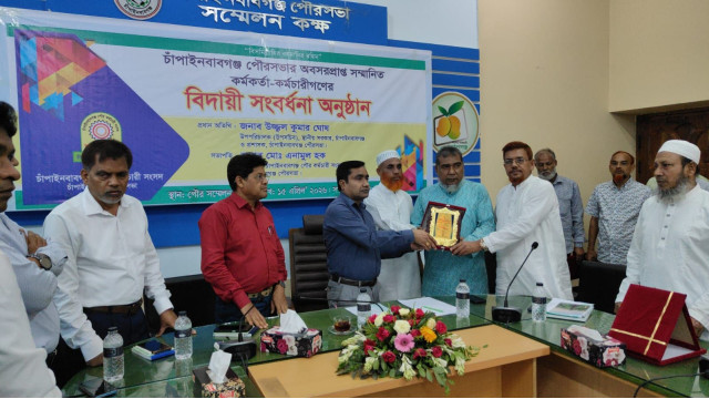 চাঁপাইনবাবগঞ্জ পৌরসভার অবসরপ্রাপ্ত সম্মানিত কর্মকর্তা ও কর্মচারীদের এক ভাবগাম্ভীর্যপূর্ণ পরিবেশে বিদায়ী সংবর্ধনা প্রদান করা হয়েছে। বুধবার (১৫ এপ্রিল) বিকেলে পৌর সম্মেলন কক্ষে এই অনুষ্ঠানের আয়োজন করা হয়।