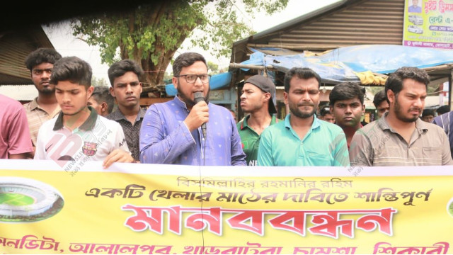 ভোলাহাটে খেলার মাঠের জন্য মানববন্ধন করেছেন ফুটানীবাজার সেবার আলো ফাউন্ডেশন।