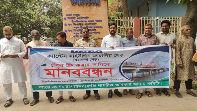 দীর্ঘদিনের দাবির প্রেক্ষিতে বীরশ্রেষ্ঠ শহীদ ক্যাপ্টেন মহিউদ্দিন জাহাঙ্গীর সেতু (মহানন্দা সেতু) টোলমুক্ত করার দাবিতে চাঁপাইনবাবগঞ্জে মানববন্ধন কর্মসূচি অনুষ্ঠিত হয়েছে।